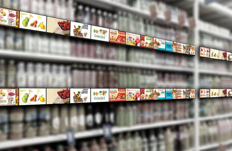 Full-color LCD/LED strips with dynamic pricing integration. Synchronized content delivery across aisles with central management via retail ERP platforms.