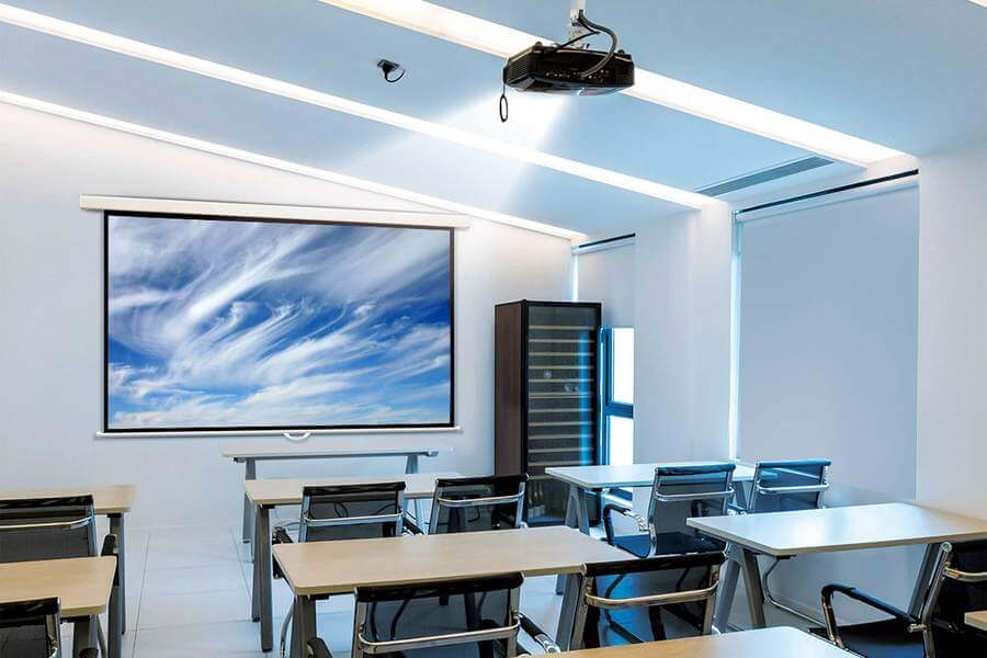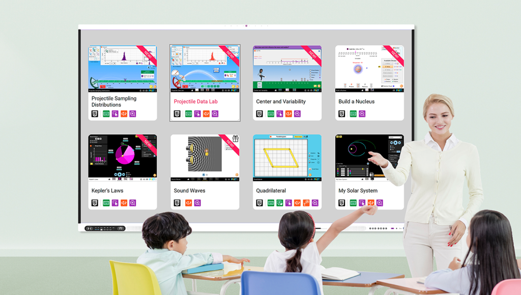 4K UHD touchscreens with anti-glare, anti-bacterial glass. Supports wireless screen sharing, whiteboarding, and hybrid learning platforms like Google Classroom and Microsoft Teams.